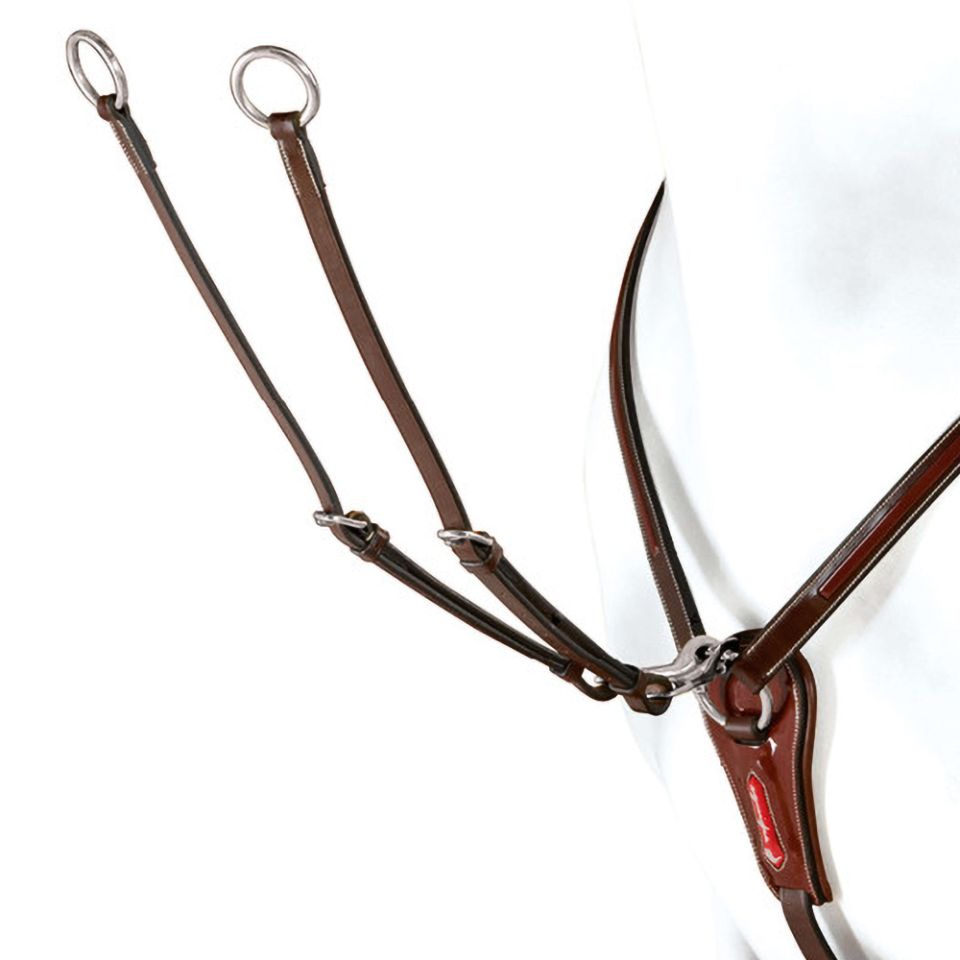 Pettorale tecnico in cuoio ed elastico con fissaggio regolabile e forchette removibili. Controllo e libertà per discipline complete.